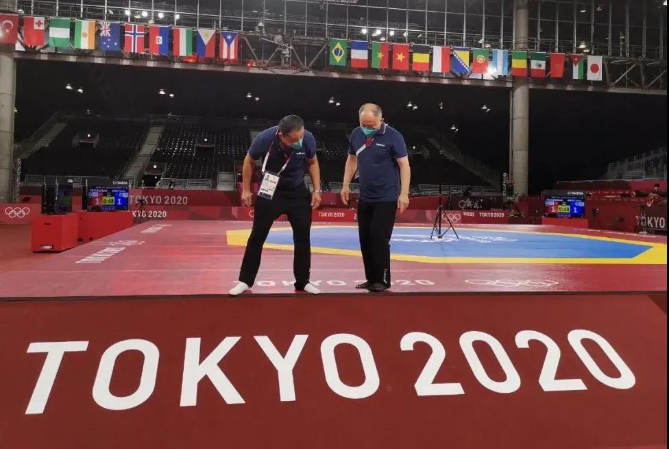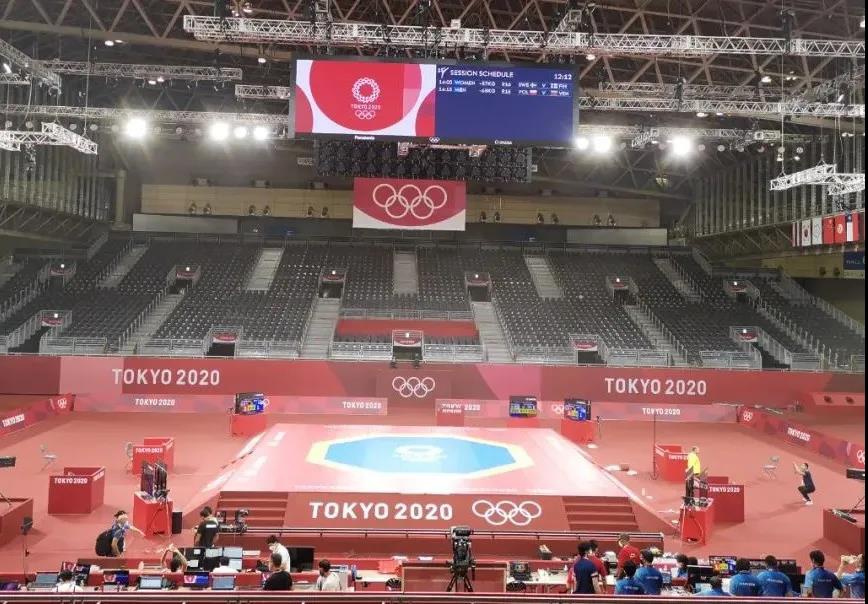 2021年7月20日,日本武道馆——奥运会柔道比赛场地。金年会体育东京奥运会服务保障团队正在布置、安装柔道器材。