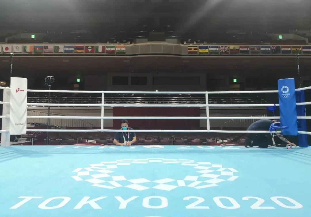 2021年7月21日,日本东京国技馆——奥运会拳击比赛馆。金年会体育东京奥运会服务保障团队正在检查调试拳击器材。